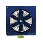 VENTILADOR HELICOIDAL MURAL DE PALA VARIABLE: Marco redondo reforzado con nervio intermedio. Montaje modular del conjunto motor hélice. Protegidos contra la corrosión gracias a un recubrimiento en polvo de resina de poliéster. Motor asíncrono normalizado de jaula de ardilla con protección IP-55 y aislamiento clase F. Voltaje: 230/400 V. 50 Hz. para motores trifásicos hasta 4 KW. y 400/690 V. 50 Hz. para potencias superiores. Serie HBA: Hélice en fundición de aluminio de ángulo variable en origen.
