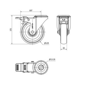 Rueda poliuretano giratoria con freno Alex diametro 125 mm. 2-0571